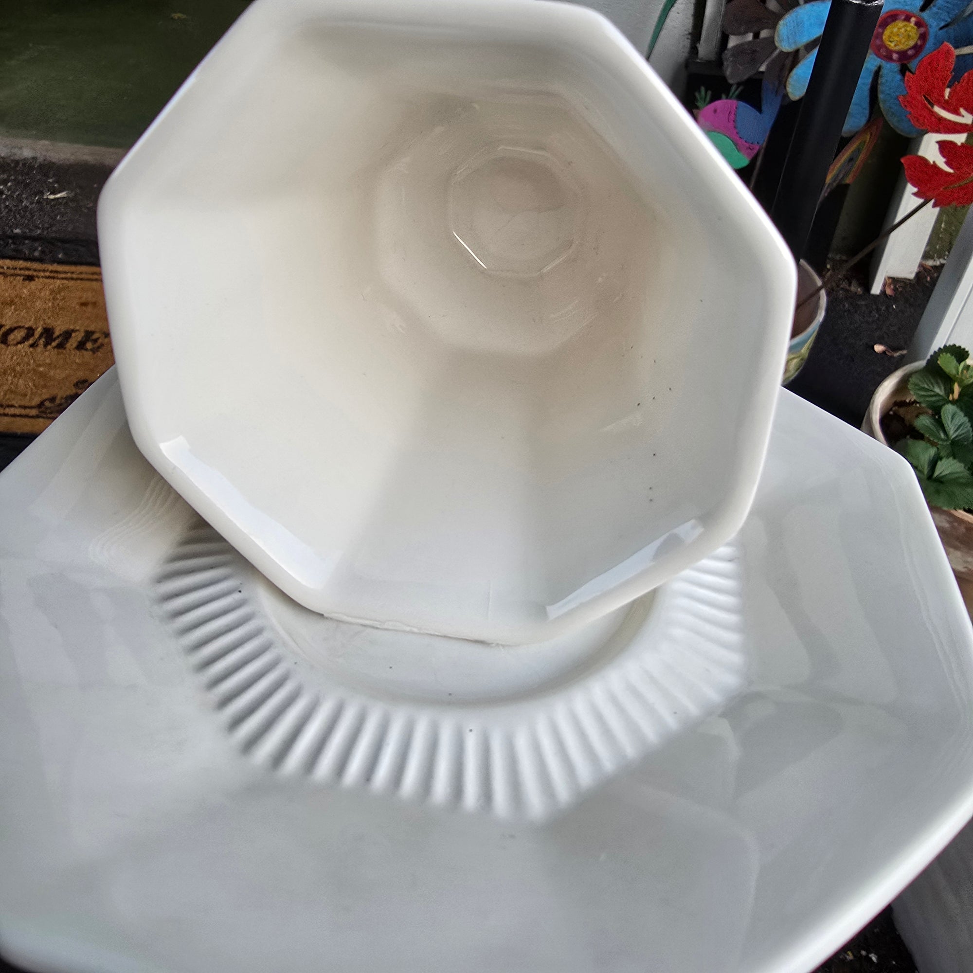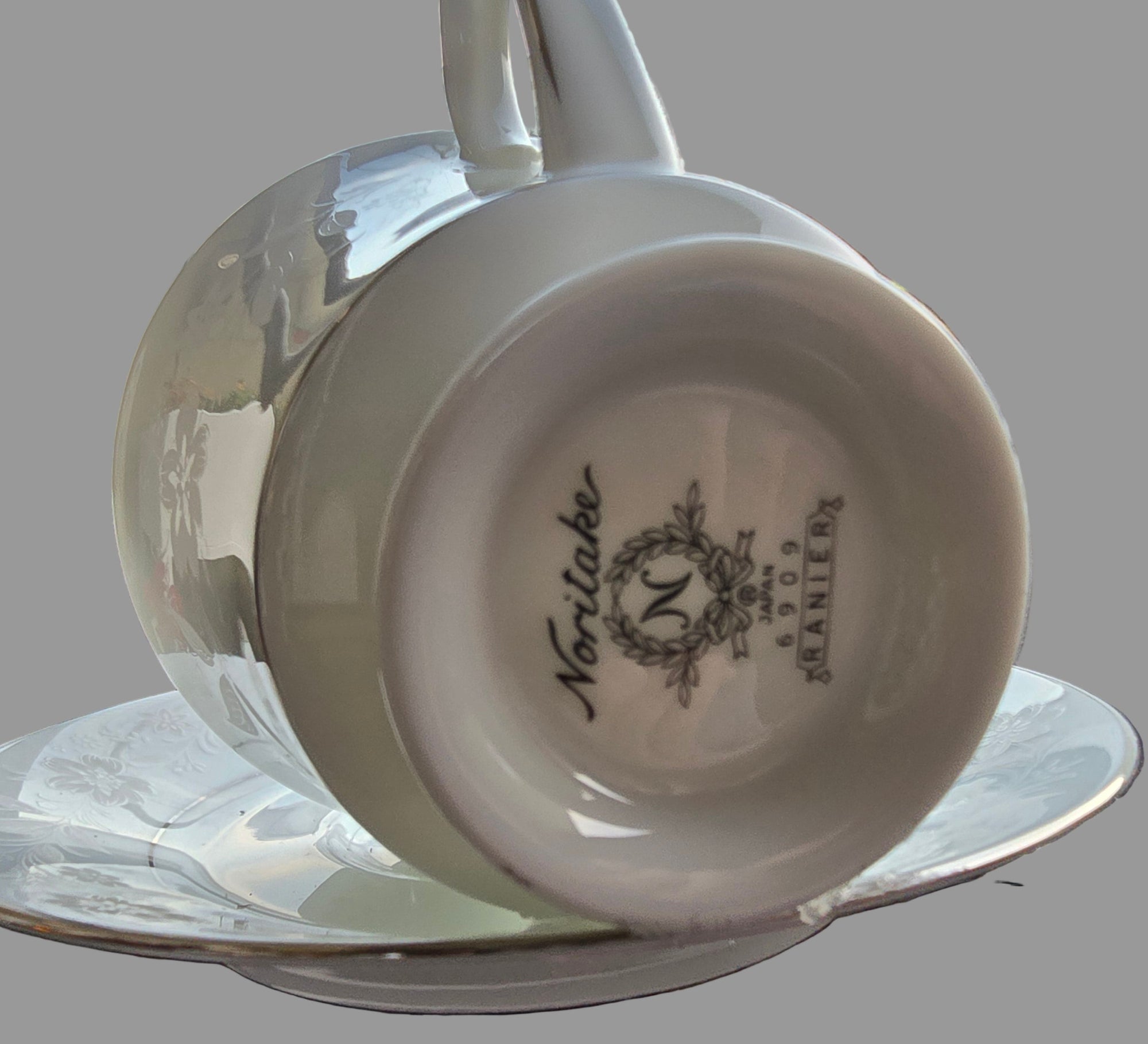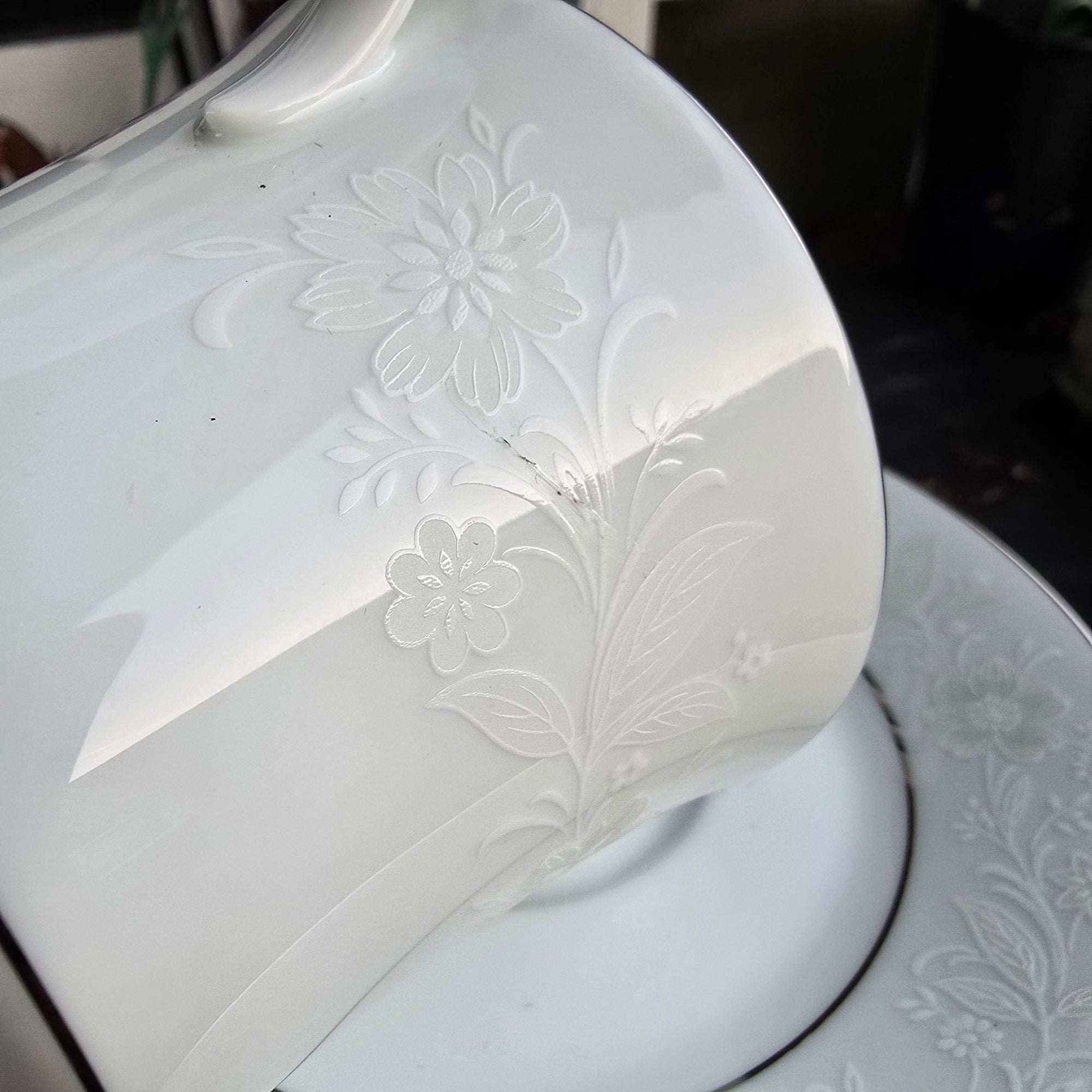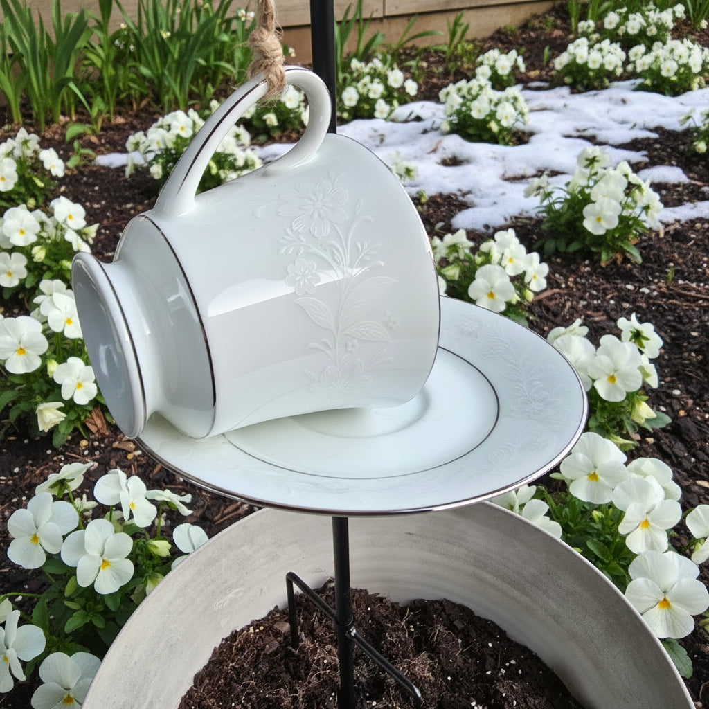 Teacup Bird Feeder - Noritake Delicate White Lace Flowers/Silver Trim