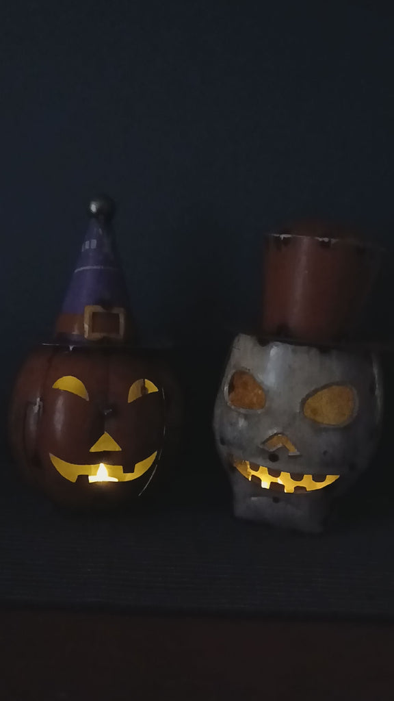 Light up fright night with this recycled metal skull lantern. He has a removable hat so you can place a tea candle inside. (Be careful. A real candle could make the metal hot)
